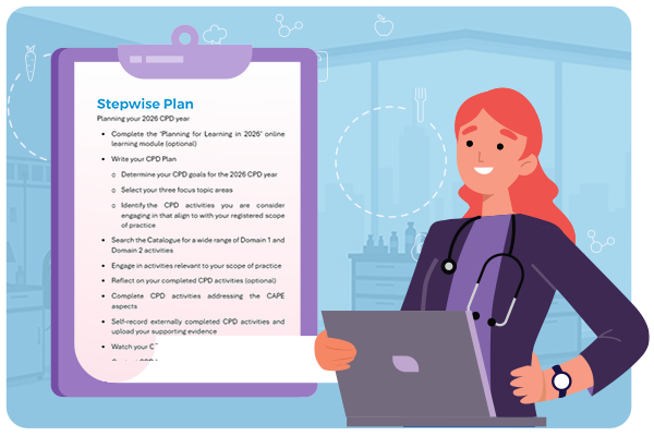 Use our CPD Plan to write your annual learning goals, identify your learning focus topic areas and the types of activities you are considering engaging in that align with your registered scope of practice.